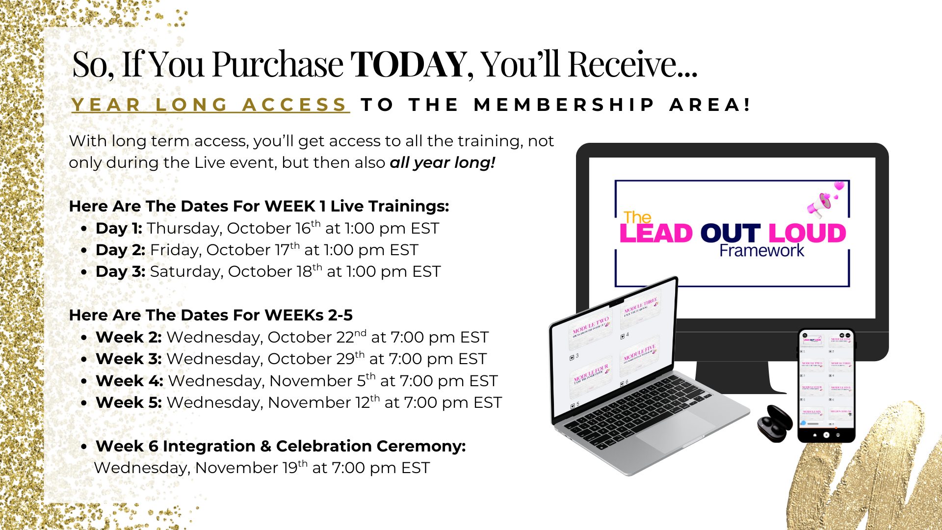 You'll have access to the entire training inside a private members area for one year. And when updates are made to the training, you'll get access to those too for no extra charge.